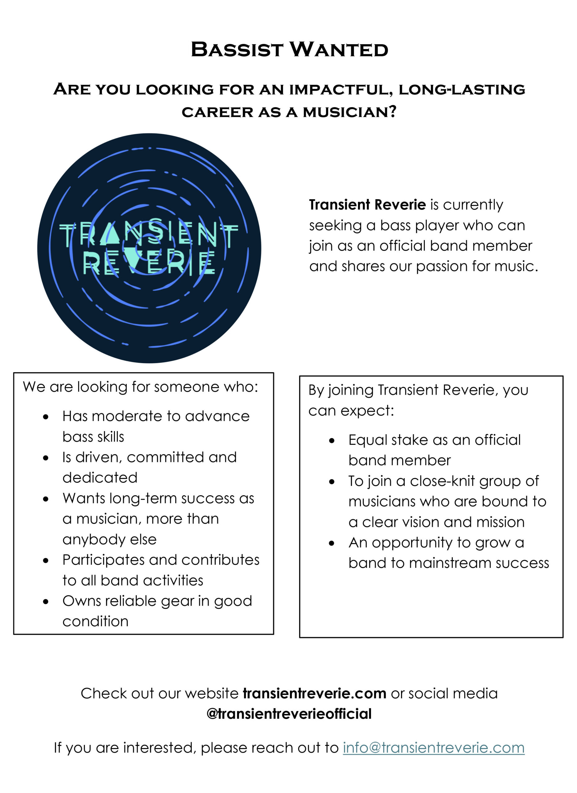 Place Ad Edit Ad Bass Player wanted for serious Rock BandClick to enlarge image.Contact InformationContact Anthony More InformationWe are looking for a dedicated Bass player that wants to join a band working to make it in the industry. Check out our Website: https://transientreverie.com/ or our socials: @transientreverieofficial